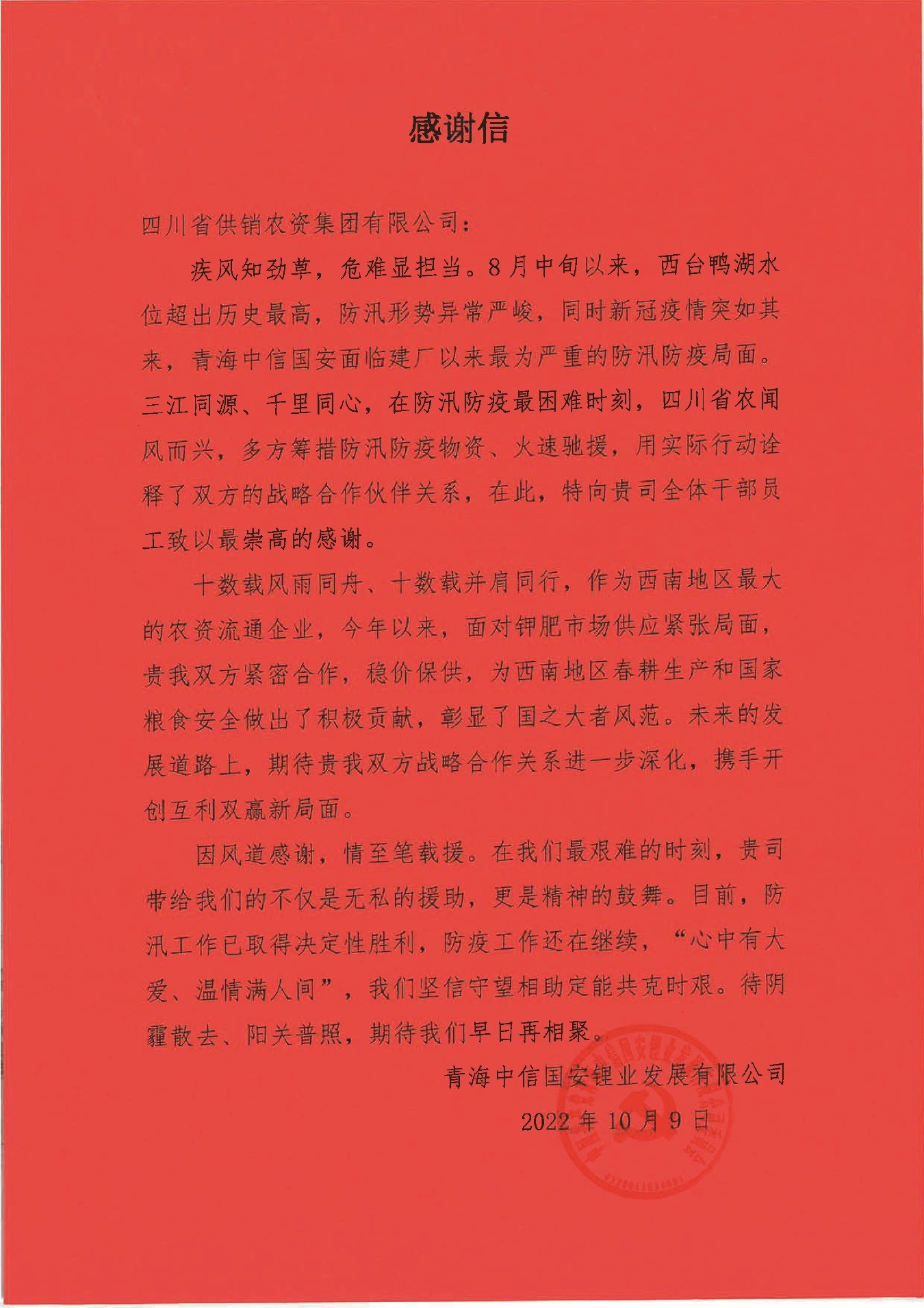 集团收到青海中信国安公司感谢信