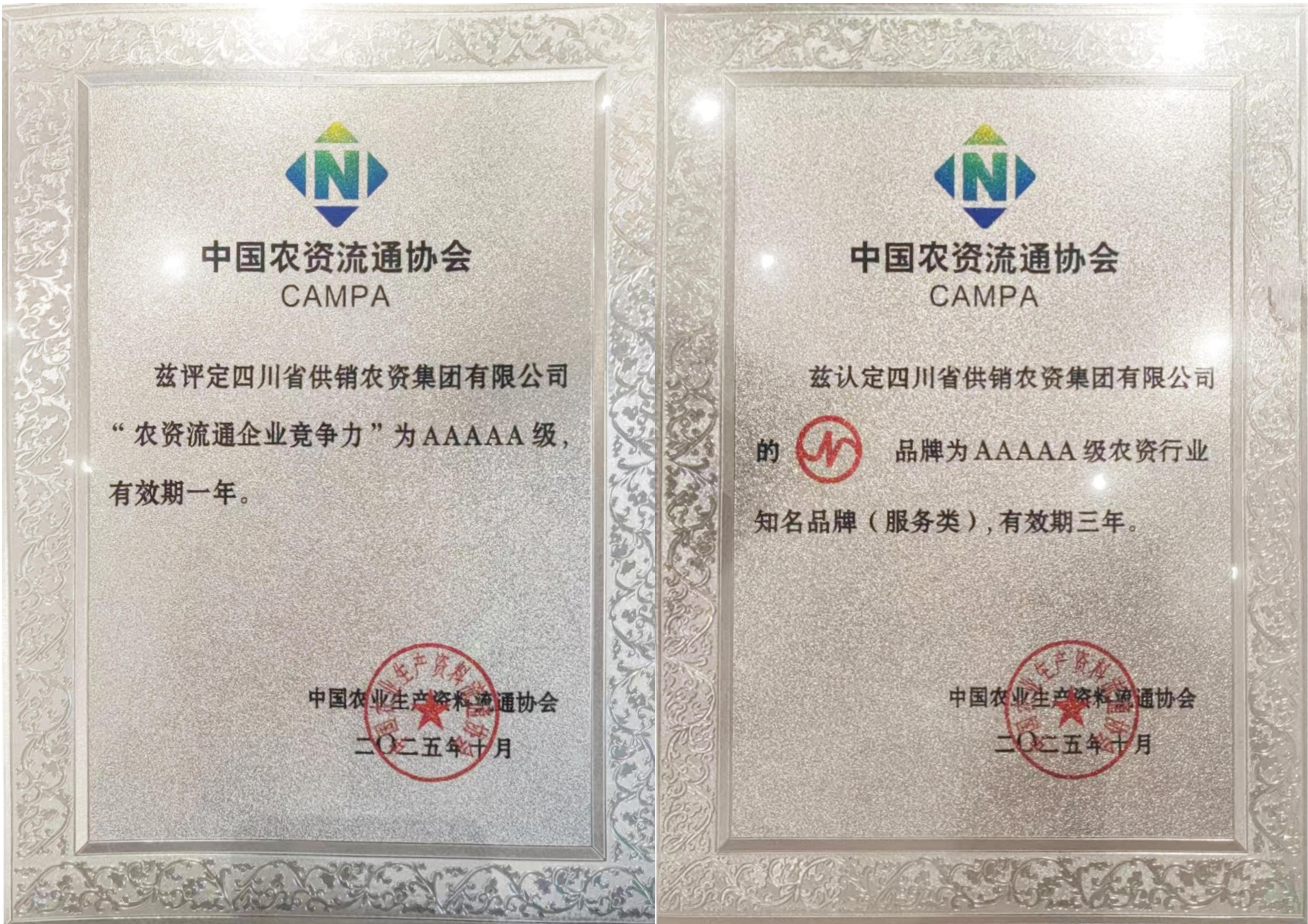 11月4日,集团党委副书记、总裁许宏勇,副总裁王建华参加2025年度中国农资经销商年会。会上,集团荣获2025年度农资流通企业竞争力AAAAA级、农资行业知名品牌(服务类)AAAAA级荣誉。